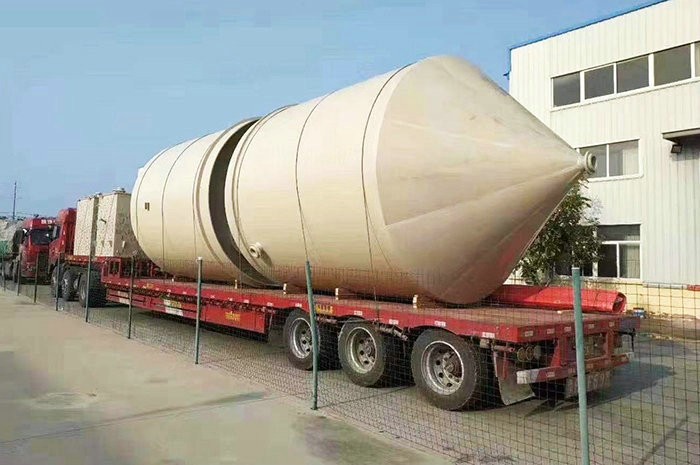 锥底储罐采用意大利技术制作,内衬层为喷射成型制作,内衬层的富树脂层树脂含量达95%,内衬层树脂含量为80%。储罐内衬层采用锥形水泥模具制作,储罐结构层为整体缠绕制作而成。罐体底部为带钢套环支腿,大大提升储罐稳定性。搅拌型锥底立式储罐,内设挡流板,罐体顶部设置支撑架,储罐轻质、高强,耐腐蚀性强、使用寿命长。
